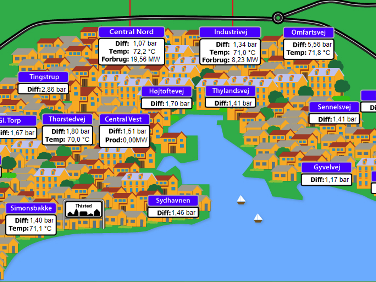 Se opbygningen af Thisted Varmeforsyning Hold øje med det aktuelle differenstryk, temperaturer og produktion.